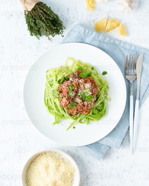 Кето-паста Болоньезе с мясным фаршем и лапшой из цуккини, фодмап, lchf, низкоуглеводная кетогенная диета. Вид сверху, крупный план, вертикальный. Чистое питание, сбалансированное питание