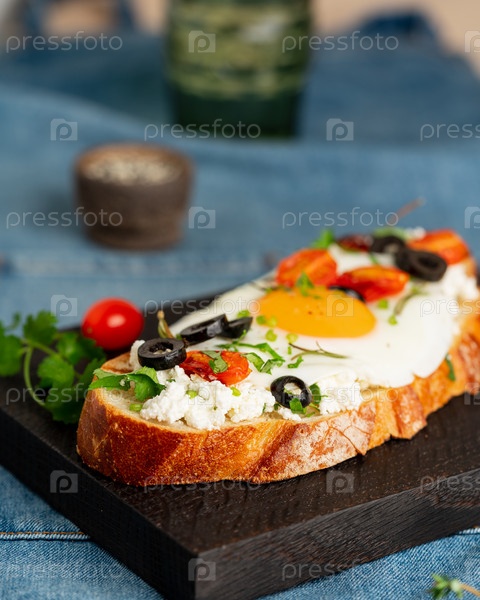 Тосты из поджаренного хлеба с яичницей с желтым желтком и помидорами, оливками, посыпанными травами на темной деревянной сервировочной доске на синей джинсовой салфетке, вертикально