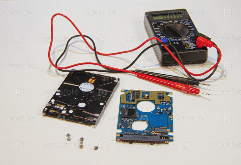 Жесткий диск разобранный для ремонта, вольтметр, запасные части и инструменты для ремонта