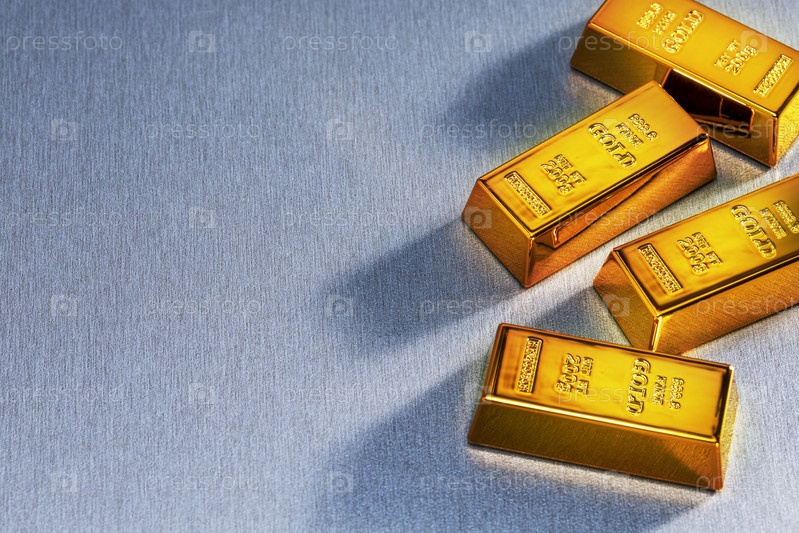 Вид сверху на золотые слитки на серой поверхности с местом для текста. финансы торговля инвестиции бизнес экономика концепция