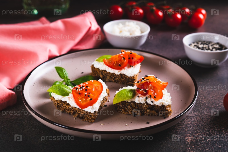 Аппетитные кростини на ржаном хлебе в форме сердца с рикоттой и помидорами на тарелке