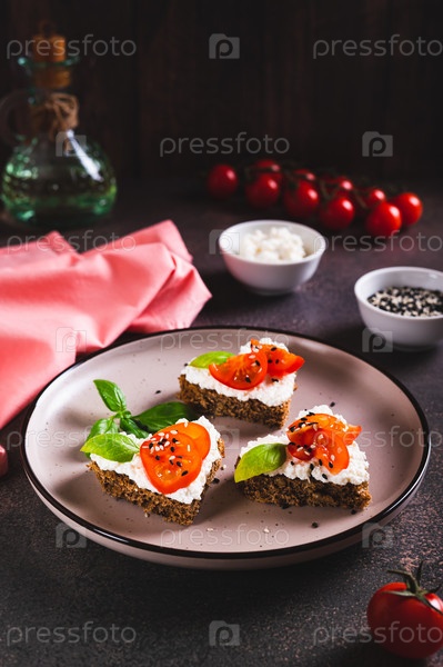 Аппетитные кростини на ржаном хлебе с рикоттой и помидорами на тарелке, вертикальный вид