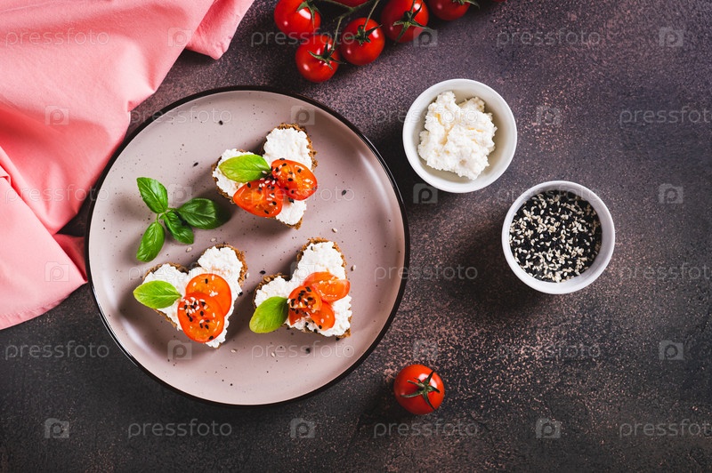 Аппетитные кростини на ржаном хлебе в форме сердца с рикоттой и помидорами, вид сверху
