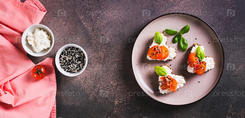 Бутерброды с сердечками, рикоттой и помидорами на ржаном хлебе на тарелке, вид сверху, веб-баннер