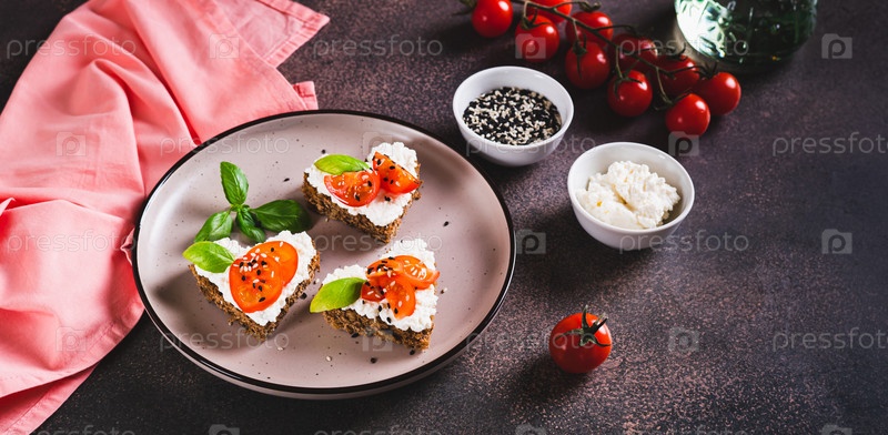 Кростини на ржаном хлебе в форме сердца с рикоттой и помидорами на тарелке веб-баннера