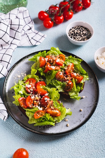 Сэндвич с помидорами и салатом на ржаном хлебе на тарелке на столе, вертикальный вид