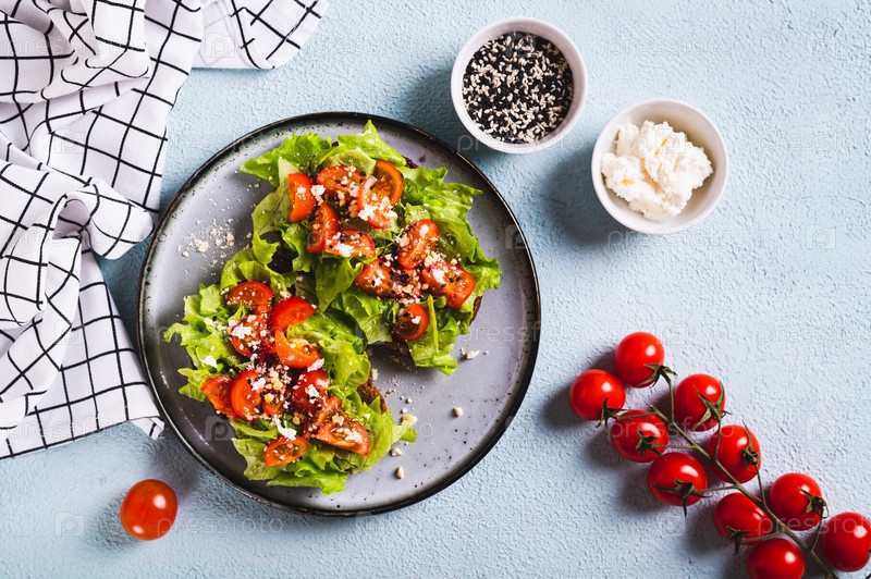 Брускетта на ржаном хлебе с салатом, помидорами и кунжутом на тарелке на столе
