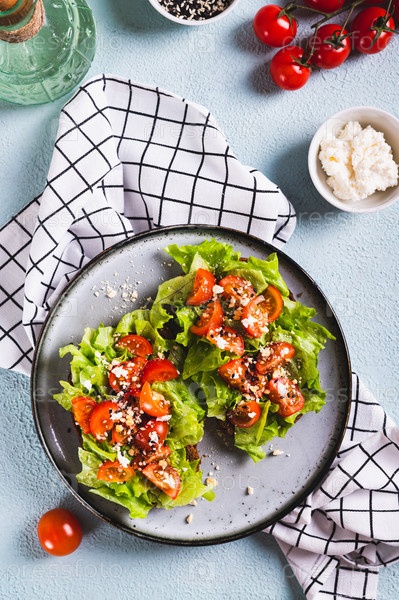 Сэндвич с помидорами и салатом на ржаном хлебе на тарелке на столе и вертикальный вид