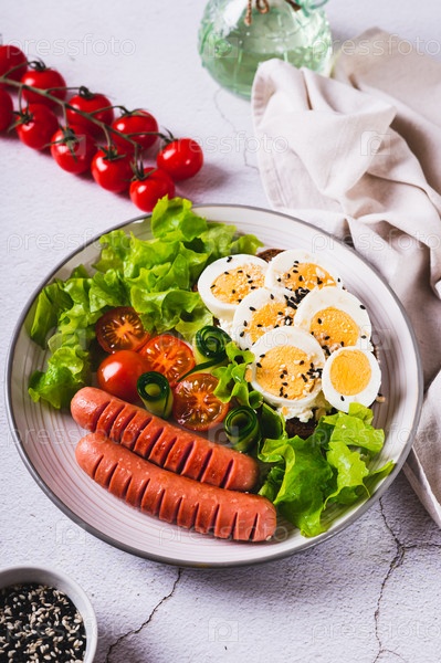 Тарелка с сосисками, сэндвичем с яйцом, помидорами и листьями салата на столе, вертикальный вид