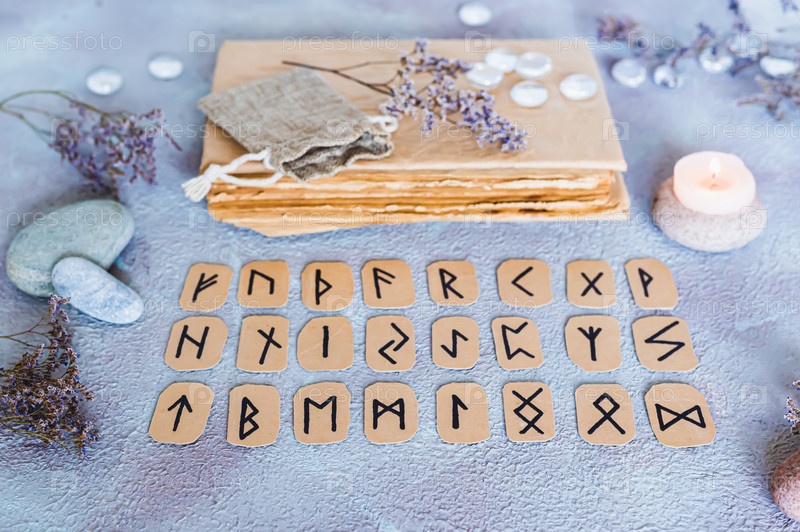 Скандинавские руны для гадания расположены в три ряда, на столе книга, камни и свеча
