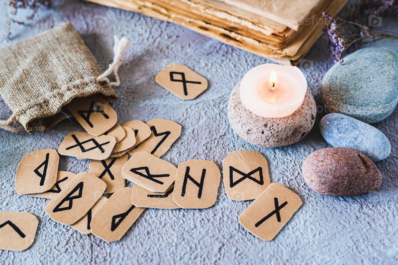 Скандинавские древние руны для гадания, сумка, свеча и камни на столе