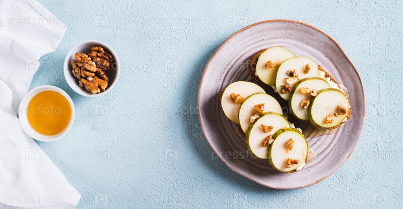 Кусочки груши, рикотты, меда и орехов на ржаных брускеттах на тарелке, вид сверху веб-баннера