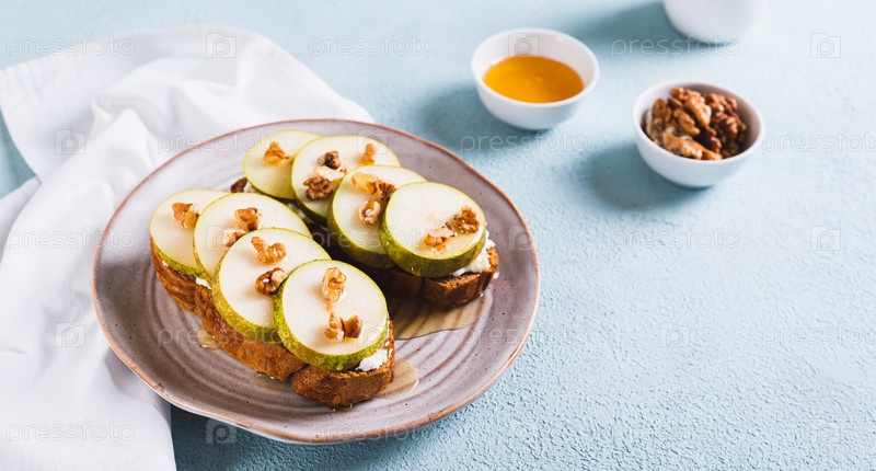 Аппетитные бутерброды на ржаном хлебе с рукколой, грушей, медом и орехами на тарелке веб-баннера