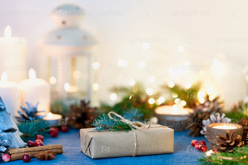 Рождественский фон с подарочной коробкой и украшениями, свечами и гирляндами огней