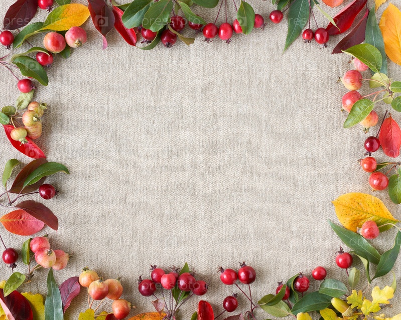 Осенний фон из ягод, маленьких диких яблок, желудей и листьев, серый льняной текстильный фон. Пустое место для текста с природными элементами