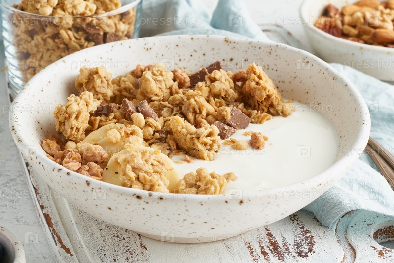 Йогурт с гранолой. Завтрак, здоровое диетическое питание. Вид сбоку, крупный план