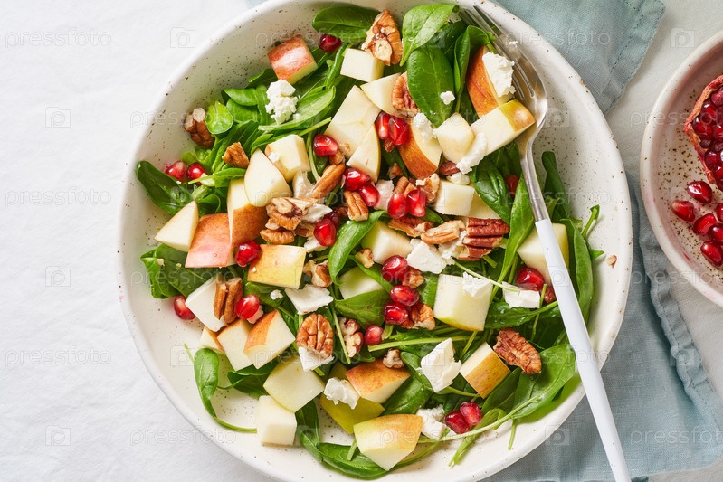 Фруктовый салат с орехами, сбалансированное питание, чистое питание. Шпинат с яблоками, орехами пекан и фетой, украшенный зернами граната, в миске на столе с белой скатертью