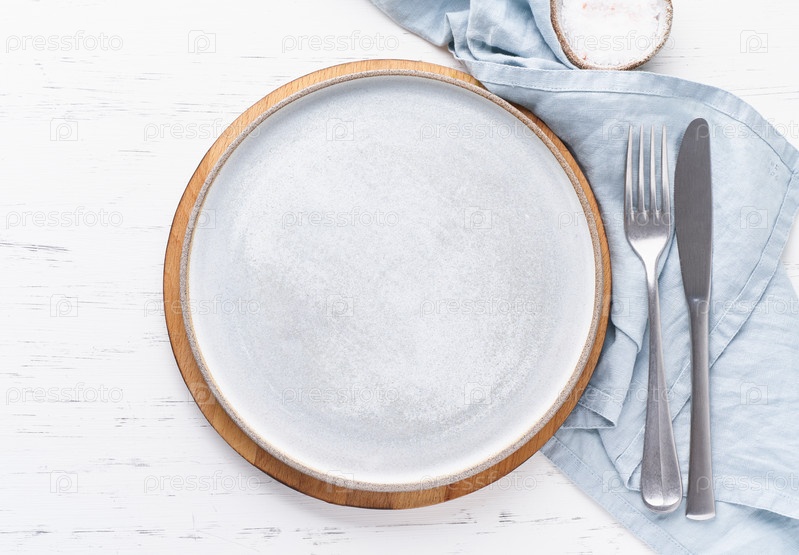 Очистите пустую белую керамическую тарелку, вилку и нож на белом каменном столе, место для копирования, макет, вид сверху. Концепция меню с посудой