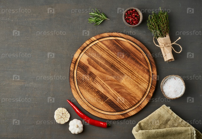 Фон приправы для еды. Меню, рецепт, макет, баннер. Круглая деревянная разделочная доска, специи, травы на темно-коричневом фоне. Вид сверху, пространство для копирования