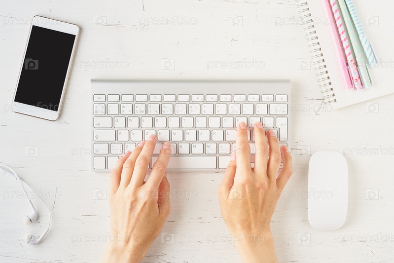 Работа на дому, онлайн обучение. Женский стол. Вид сверху. Дистанционное обучение. Руки женщины печатают на ноутбуке. Фрилансер, концепция цифрового кочевника