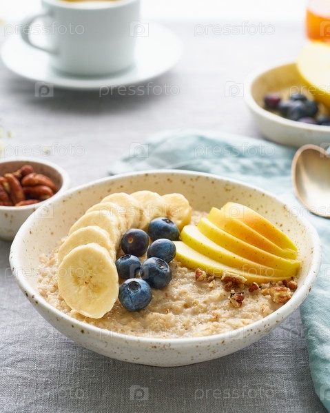 Цельная овсянка, большая миска каши с бананом, черникой, яблоком, орехами на завтрак, утренний прием пищи. Вид сбоку, крупный план, вертикальный, серый стол. Веганская вкусная здоровая диета