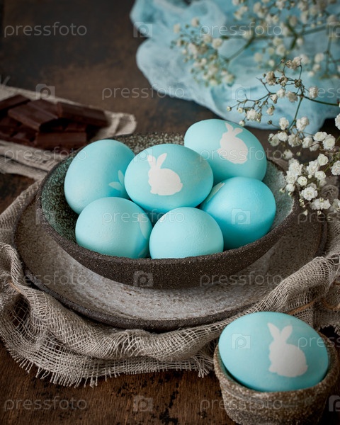 Необычная Пасха на темном старом фоне. Керамическая коричневая миска с голубыми яйцами и кроликом. Темнота, лучи солнечного света освещают яйца. Концепция новой жизни, возрождения. Деревенский стиль. Вертикальное пространство для копирования