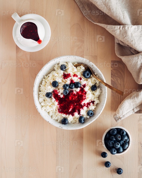 Белая миска домашнего творога с вареньем, малиной, черникой на коричневом деревянном столе, вид сверху, крупный план, вертикальный