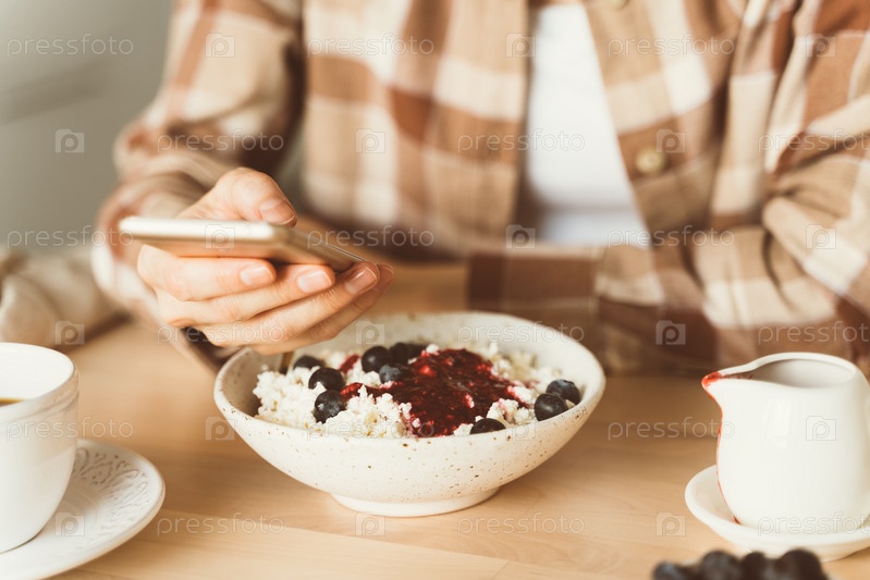 Женщина ищет информацию в Интернете, используя мобильный телефон, во время завтрака. Концепция цифровой зависимости