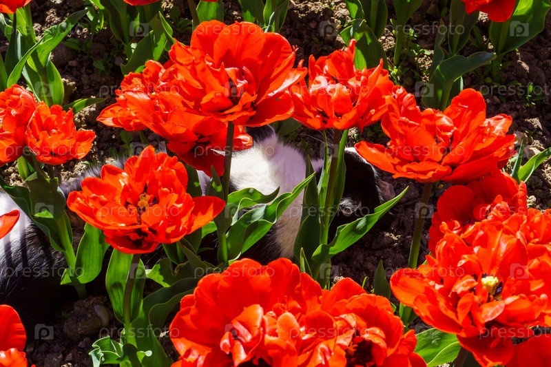 Кошка отдыхает в тюльпанах. Никитский ботанический сад. Крым