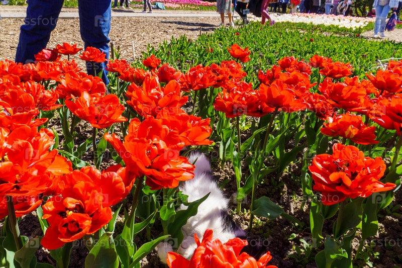 Кошка отдыхает в тюльпанах. Никитский ботанический сад. Крым