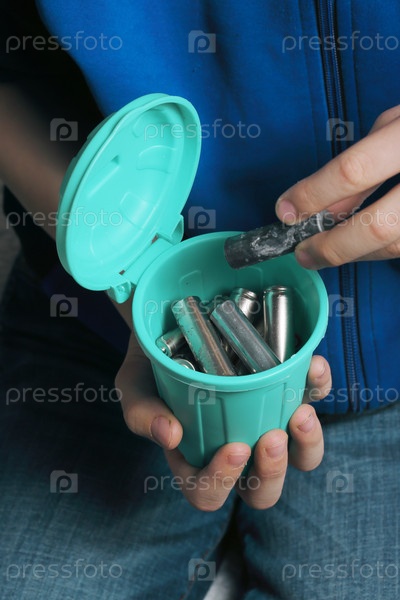 Миниатюрный мусорный бак с выброшенными батарейками, выброшенный рукой подростка, подчеркивает экологически чистые методы и усилия по переработке отходов. Экологическая осведомленность