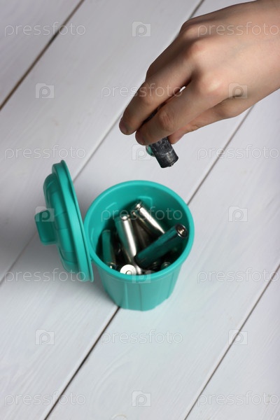 Крупный план подростка, выбрасывающего использованные батарейки в небольшой мусорный бак, пропагандируя переработку отходов и устойчивое развитие. Концепция экологии и управления отходами