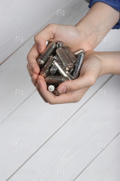 Подросток демонстрирует использованные пальчиковые батарейки в ладонях, выступая за утилизацию отходов и экологически сознательное поведение
