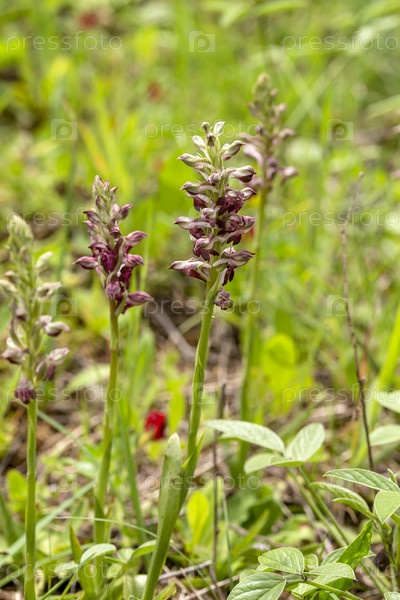 Цветочное растение (Anacamptis coriophora subsp. fragrans) крупным планом в естественной среде обитания