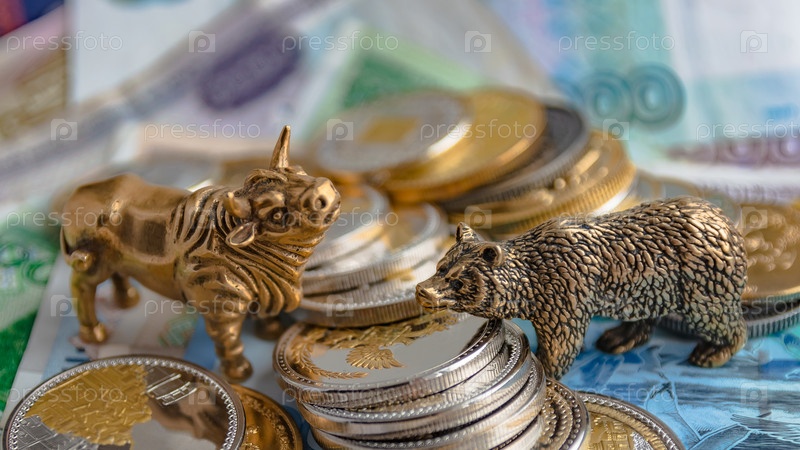 Бронзовые фигурки быка и медведя украшены бумажными и металлическими монетами. Размытие фона. Символ и концепция торговли на фондовой бирже