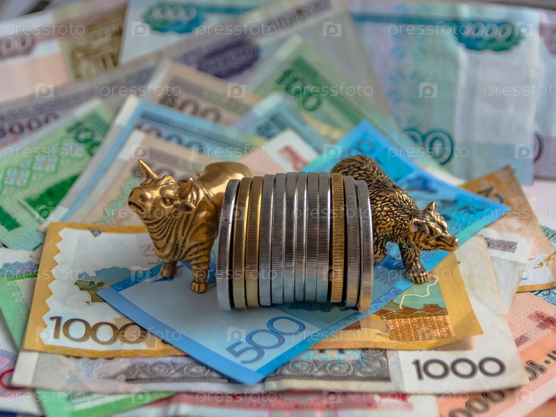 Бронзовые фигурки быка и медведя возле металлических монет на фоне бумажных денег. Размытие фона и перспективы. Концепция и символ фондовой биржи и торговли акциями