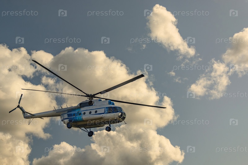 Пассажирский вертолет Ми-8 летит. Голубое облачное небо на заднем плане