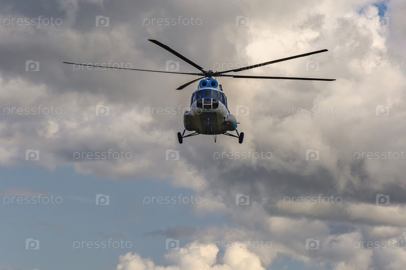 Пассажирский вертолет Ми-8 летит. Голубое облачное небо на заднем плане