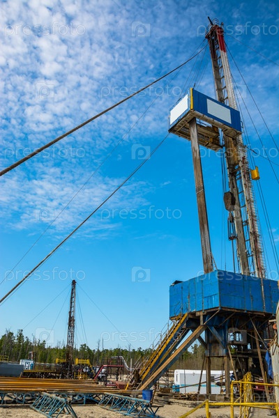 Мобильная буровая установка для бурения нефтяных и газовых скважин. На фоне голубого неба. Арматура для добычи нефти и газа расположена рядом с буровой