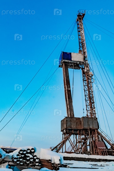 Бурение глубокой скважины с помощью буровой установки на месторождении нефти и газа. Месторождение расположено на Крайнем Севере за Полярным кругом. Съемки проводились зимой во время полярного дня