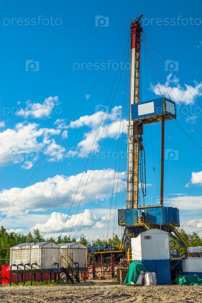Мобильная буровая установка для бурения нефтяных и газовых скважин. На фоне голубого неба. Арматура для добычи нефти и газа расположена рядом с буровой