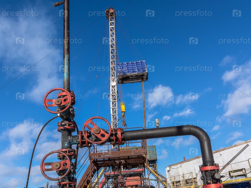 Фонтанные клапаны для добычи нефти на заднем плане буровой установки. Круглое колесо для регулирования потока нефти из скважины. Весенний солнечный день в Западной Сибири