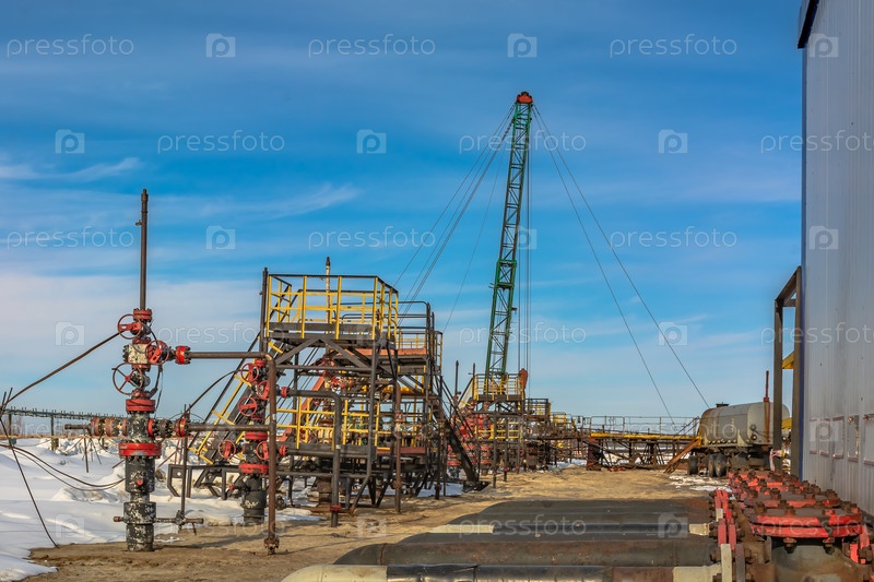 Нефтяное месторождение в Сибири. В ряд идут нефтедобывающие скважины. На заднем плане ведутся работы по капитальному ремонту скважины. На переднем плане коллектор с клапанами