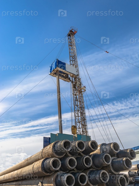 Бурильные трубы на переднем плане. На заднем плане — мобильная буровая установка для бурения нефтяных и газовых скважин. Фон - голубое небо с облаками