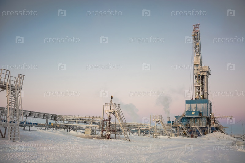 Оборудование и инфраструктура для добычи газа из скважин арктического месторождения. Зимний полярный день. Буровая установка на заднем плане