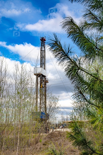 Буровая установка для нефти и газа на заднем плане в фокусе. На переднем плане молодые деревья весной не в фокусе. Весенняя природа Сибири. Солнечный день
