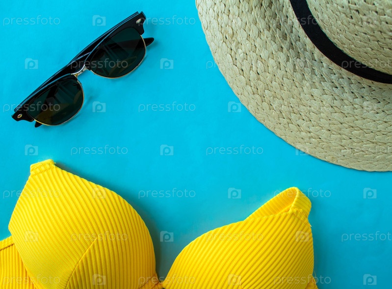 Летний отпуск. Купальник, солнцезащитные очки и шляпа на синем фоне