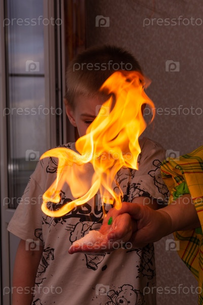 Фокус с огнём в руке. У ребенка огонь на ладони. День рождения. Детский праздник. Трик с огнем на вашей руке. Ребенок имеет огонь в ваших руках. День рождения. Детская вечеринка