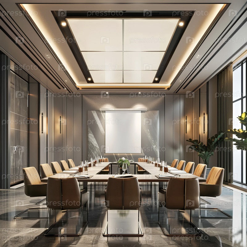 Интерьер стильного открытого офиса с серыми и деревянными стенами, кафельным полом и рядами деревянных компьютерных столов с белыми стульями. 3D-рендеринг