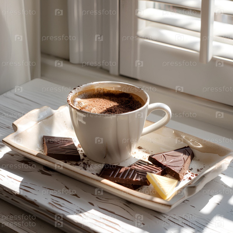 Белая кружка с кусочками кофе и шоколада на красивом подносе в светлой комнате
